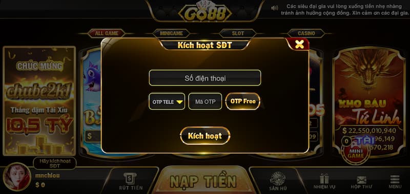 Bước 4. Kích hoạt tài khoản đăng ký Go88 bằng số điện thoại